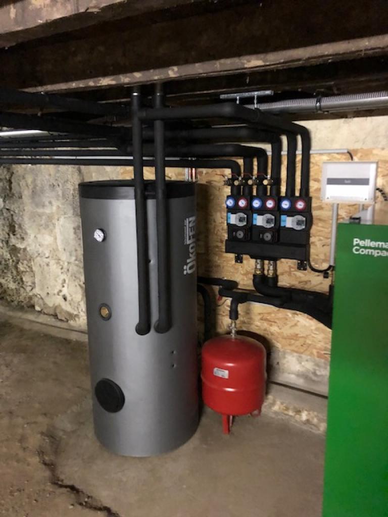 Nous avons installé dans une magnifique maison en pierre à la campagne, une chaudière à granulés de bois Ökofen Compact d'une puissance de 32 kW en remplacement d'une chaudière fioul. Cette chaudière biomasse labellisée Flamme verte 7 étoiles est raccordée à un réseau de radiateurs avec 2 zones de chauffage. Elle est alimentée de façon automatique par un silo textile d'une capacité de 5,5 à 7 tonnes. Le remplissage est effectué une fois par an avec un camion souffleur.